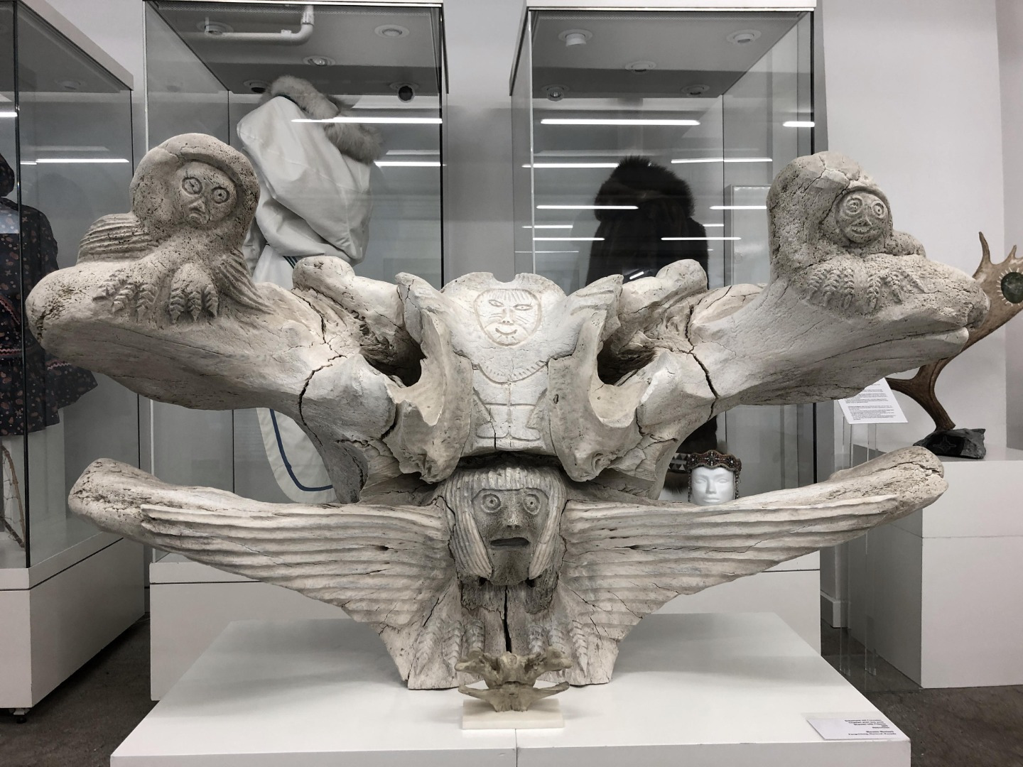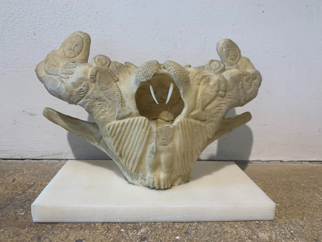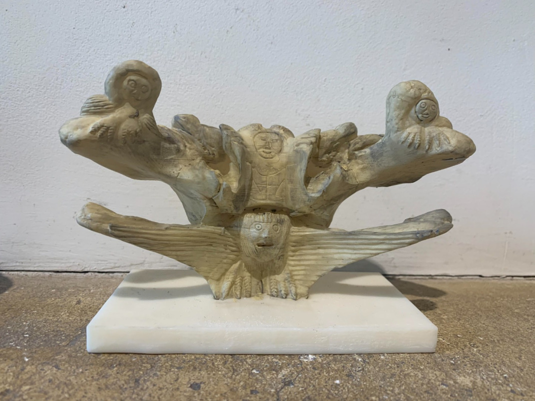 Original Carving together with the printed 1/8 scale model (in front and below). « Shaman with familiars » (2009) Original Whalebone carving by Manasie Maniapik, Pangnirtung, Nunavut, Canada Museum Cerny, Bern, Suisse, Inv.No. 2009.07 ©, scale model by T. Sarnet © 2022.